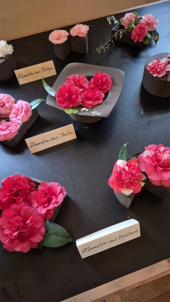 Kurtisanen wie auch hochgestellte Damen der Aristokratie trugen die Kamelie im Haar. Sie war Erkennungszeichen der italienischen Freiheitskämpfer um eine geeinte Republik. In Japan aber steht die Kamelie für den Frühling und den Neubeginn. Sie symbolisiert Göttlichkeit, aber auch Perfektion. In China verbindet man Kamelien mit Schönheit, Reinheit und Treue. Neuseelands Frauen erkämpften mit einer weißen Kamelie als erstes Land der Welt das Frauenwahlrecht. In Amerika, im Staate Alabama, wählte man die Kamelie zur Wappenblume. „Diese ganz verschiedenen Kamelienwelten wollen wir in unserer Kamelienausstellung 2025 vorstellen“, erklärt Riedel.