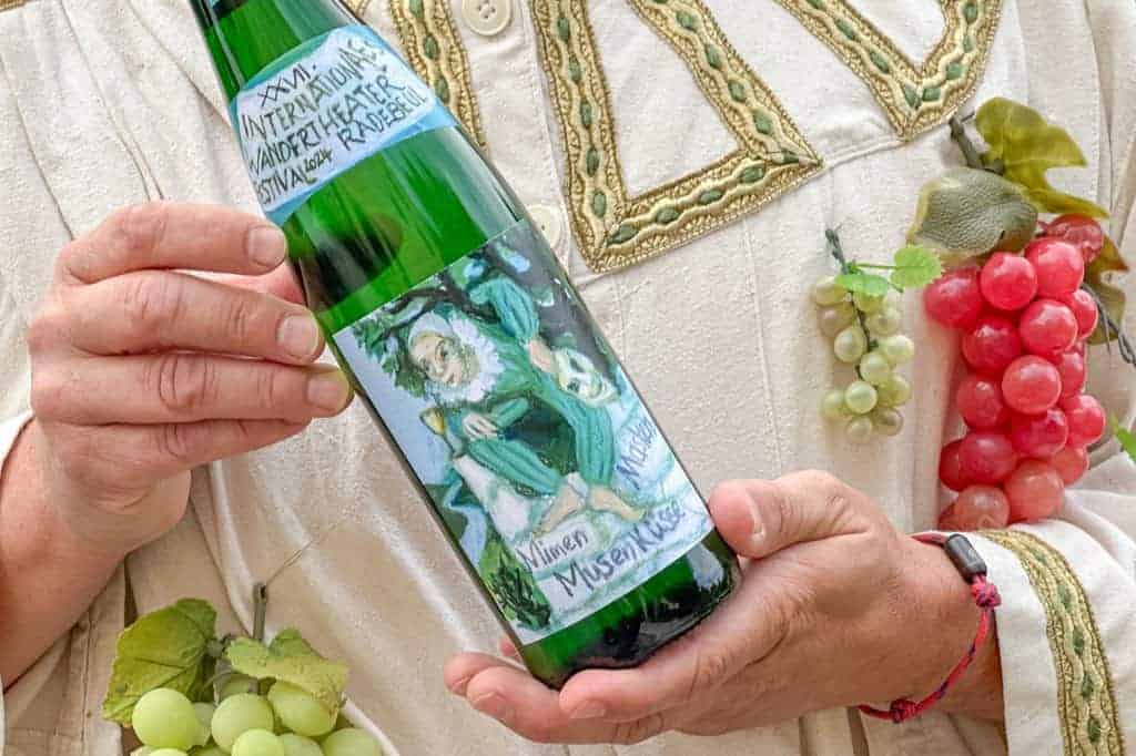 Sascha Graedtke gibt den Bacchus – und er kommt nicht mit leeren Händen, denn auch in diesem Jahr gibt es wieder einen ganz speziellen Wein zum Fest. Also zeigt er eine Flasche der Weinsonderedition, die auf 350 Flaschen limitiert ist. Der Erlös aus dem Verkauf kommt dem Förderverein des Internationalen Wandertheaterfestival zugute, das traditionell wieder parallel zum Weinfest stattfindet und diesem den bundesweit einmaligen Reiz gibt. Wie hat ein berühmter Künstler (ich glaub’, es war Wenzel…) mal gesagt: „Kunst sorgt dafür, dass wir den Wein genießen. Ohne die Kunst wär’s doch nur Saufen!“ Etwas derbe, aber durchaus richtig.