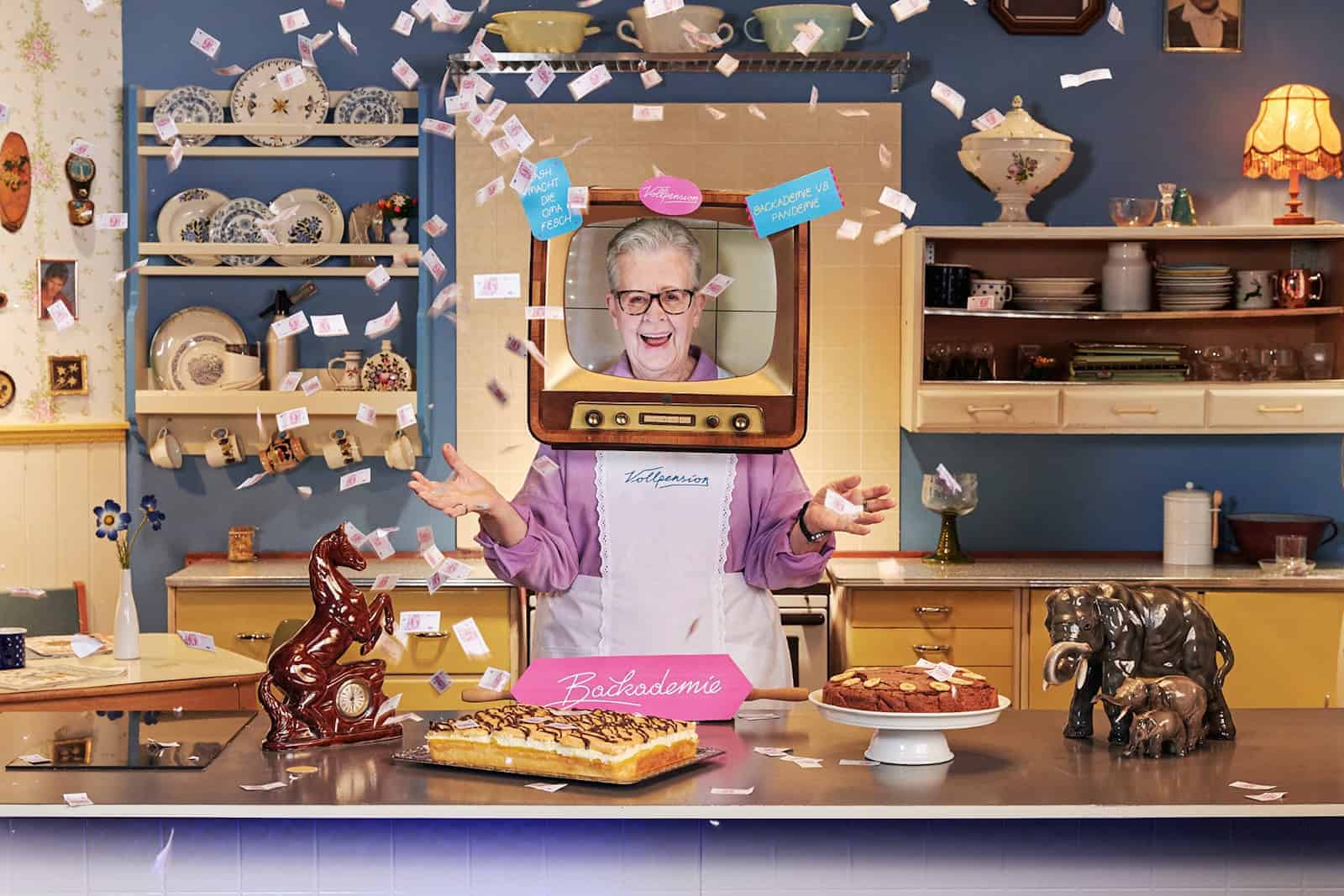 Mutter Mayr im Kochstudio des „Generationencafé Vollpension“ bei den Drehaufnahmen zu ihrem Backkurs. Foto: Vollpension