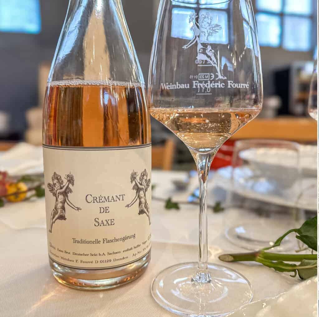 Damit der Sekt so schön zartrosa aussieht, wurden zwei Rebsorten vor der zweiten Gärung cuvetiert: Müller-Thurgau und Regent, also eine weiße und eine rote Sorte. Ausgebaut wurde der Wein – wie alles vom Fourré – im Keller von Schloss Proschwitz: diese Art der Zusammenarbeit zwischen sächsischen Winzern gehört durchaus zu den positiven Eigenarten der Region…
