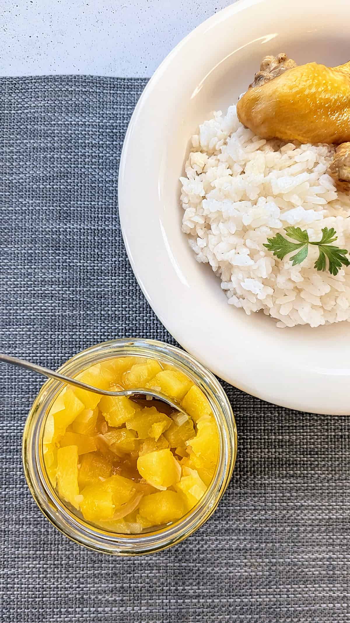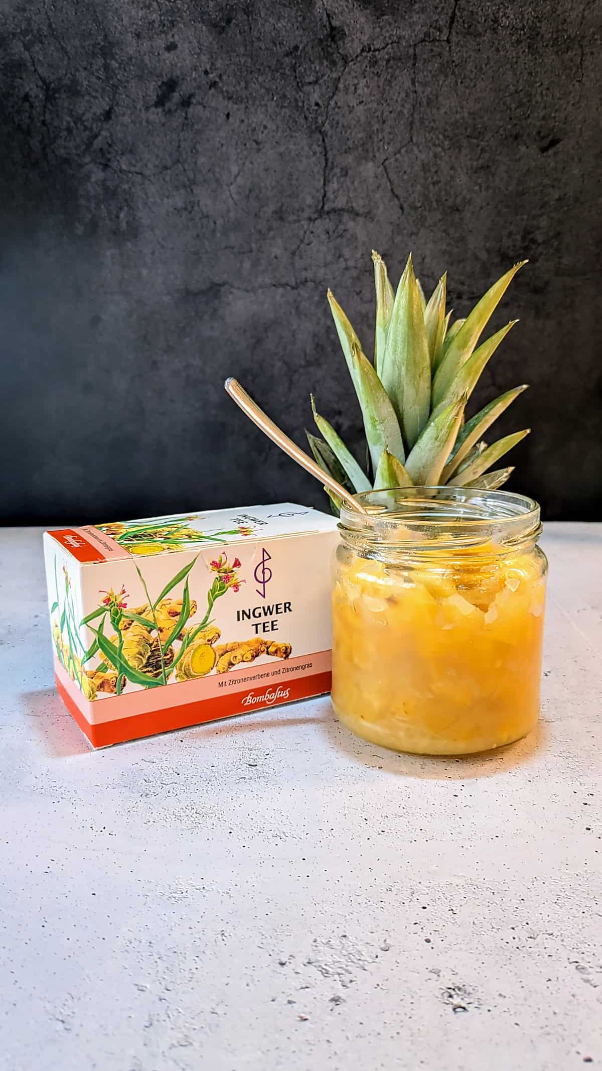 Ananas-Chutney mit Ingwertee - wenn Sie die Kombination aus süß und herzhaft mögen, dann sollten Sie dieses Rezept ausprobieren. Es passt wunderbar zu Hähnchen und Reis. Der verwendete Tee stammt natürlich aus dem Bombastuswerk, das Rezept hat sich der Teeverband einfallen lassen.