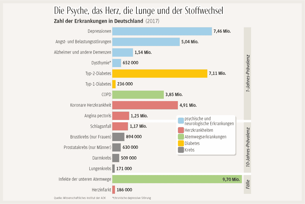 Grippe, Bronchitis, Lungenentzündung: Fast zehn Millionen Mal pro Jahr suchen Patienten in Deutschland wegen dieser und anderer Erkrankungen der unteren Atemwege die Hilfe beim Arzt – und damit so oft wie bei keiner anderen Krankheit. Das geht aus einer neuen Studie des Wissenschaftlichen Instituts der AOK (WIdO) hervor. Für die Analyse, bei der Covid-19 noch keine Rolle spielt, wurden für 18 verbreitete Erkrankungen die Abrechnungsdaten aller 27 Millionen AOK-Versicherten auf die gesamte Bevölkerung hochgerechnet und bis auf Regionen aufgeschlüsselt.