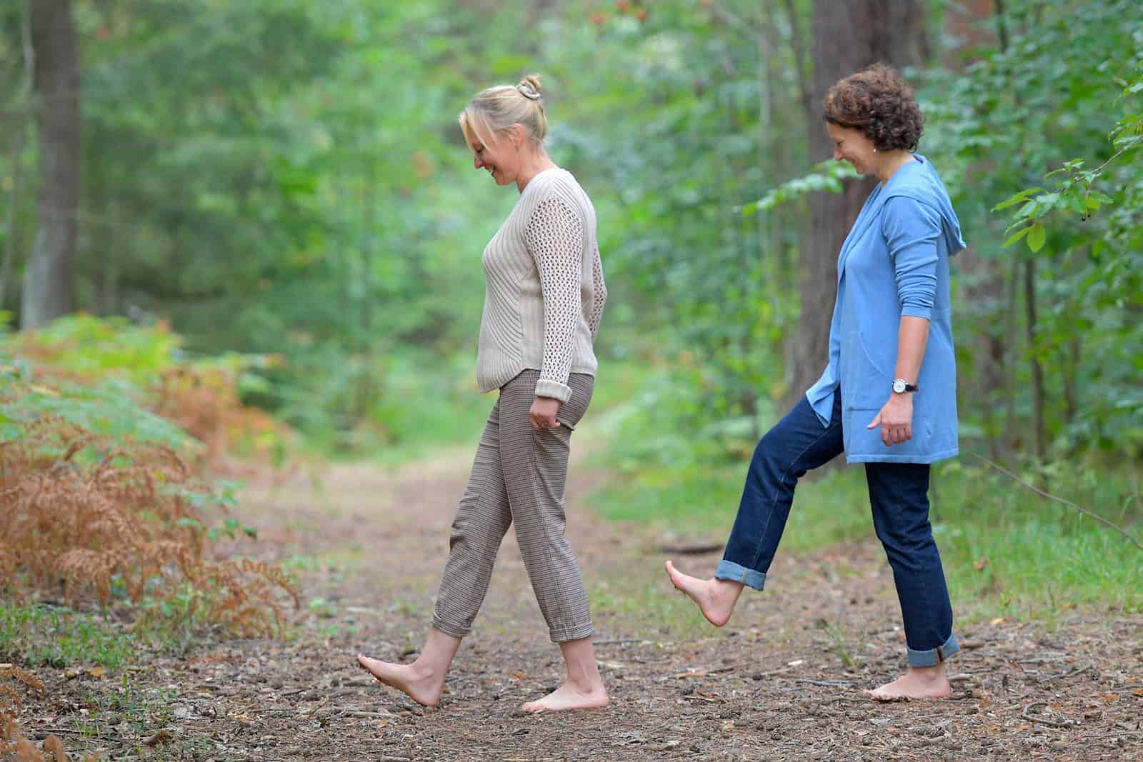 Erst die Ferse, dann langsam den ganzen Fuß: Die Dresdnerin Antje Jessen zeigt Redakteurin Susanne Plecher achtsames Gehen. Foto: Matthias Rietschel