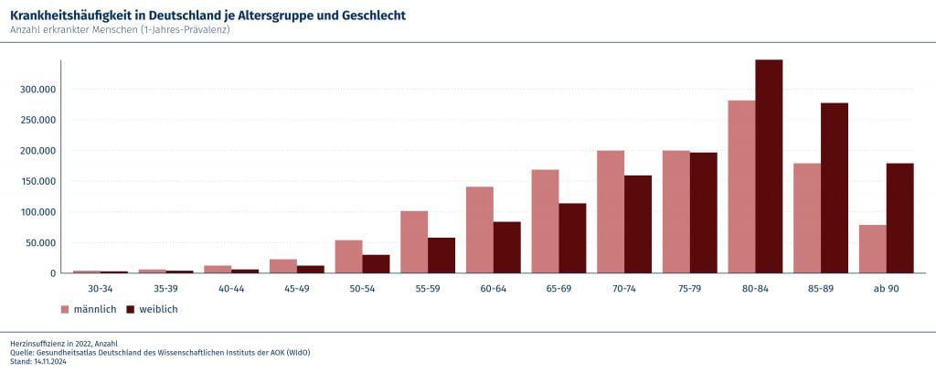 2022 waren in Sachsen 207.400 Menschen an Herzschwäche erkrankt. Das entspricht 6,21 Prozent der sächsischen Bevölkerung. Im Bundesdurchschnitt waren 2022 4,98 Prozent erkrankt. Damit steht der Freistaat nach Sachsen-Anhalt und Thüringen an dritthöchster Stelle in Deutschland, so das Ergebnis einer Auswertung des Wissenschaftlichen Institutes der AOK (WIdO), die im Gesundheitsatlas unter www.gesundheitsatlas-deutschland.de/erkrankung/herzinsuffizienz abrufbar ist. Bei der regionalen Verteilung innerhalb Sachsens herrscht ein starkes Stadt-Land-Gefälle: Während in Städten wie Dresden und Leipzig der Anteil bei unter fünf Prozent liegt, sind es im Erzgebirgskreis 8,8 Prozent, im Vogtlandkreis 7,36 Prozent und in Mittelsachsen 6,94 Prozent.